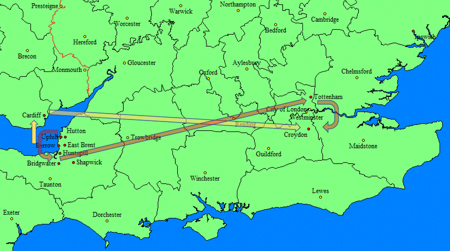i.e. Huntspill → Uphill → Hutton → Shapwick → Bridgwater → Tottenham → Croydon area.Without sharing 5 x Great Grandparents, we would have each had 128 ancestors in that generation, but by sharing we have made a contribution to the fact that the world population was not enormously larger hundreds of years ago.